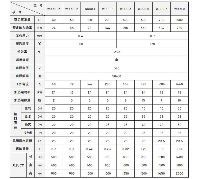 WDR電蒸汽發(fā)生器采用低表面熱負(fù)荷電熱元件,每一元件均進(jìn)行水壓及耐電壓試驗(yàn);接上電源及水源后即可工作。安靜、清潔,符合環(huán)保的要求,不會向大氣排放NOx(氮氧化合物)。電蒸汽發(fā)生器操作簡便,一鍵啟動(dòng)、停止,3分鐘出蒸汽,運(yùn)行負(fù)荷調(diào)節(jié)范圍大,維護(hù)簡便。每組電熱元件采用集中束型法蘭連接,獨(dú)立設(shè)置,機(jī)械強(qiáng)度高,安全可靠,更換方便,使用壽命長等特點(diǎn)。